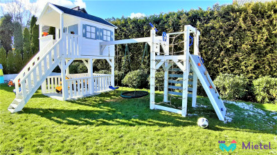 Pod domkiem znajduje się garaż na pojazdy małego "kierowcy". Frajdę maluchom sprawi wieża ze ścianką wspinaczkową, drabinką i siatką.