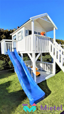 Przestronny domek wyposażony w bezpieczne schody oraz zjeżdżalnię.