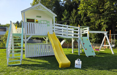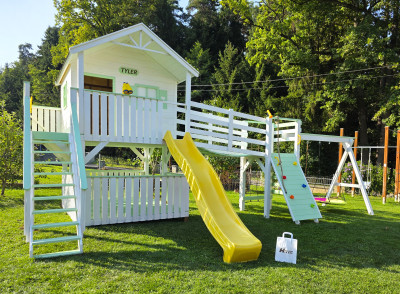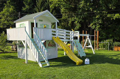 Domek wyposażony jest w górny boczny taras oraz dodatkowy taras pod domkiem, które tworzą idealne miejsce do relaksu i zabawy na świeżym powietrzu.