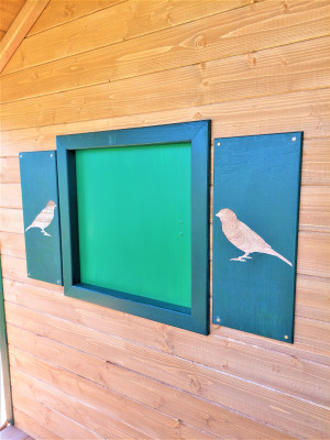 Domek o wymiarach 170x200cm, malowany impregnatem w kolorze dębu z dodatkiem zielonych elementów.