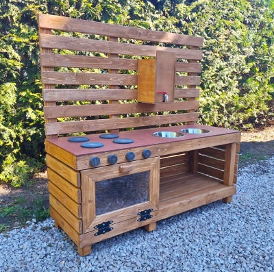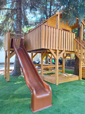 Domek duży z bocznym tarasem L to estetyczne i funkcjonalne rozwiązanie, które zachwyci każde dziecko. Pod domkiem znajduje się zamykana piaskownica oraz zestaw biwakowy, idealny do chwili odpoczynku w trakcie zabawy. Całość uzupełnia kuchnia błotna, która pozwoli na kreatywne spędzanie czasu na świeżym powietrzu i rozwijanie wyobraźni.