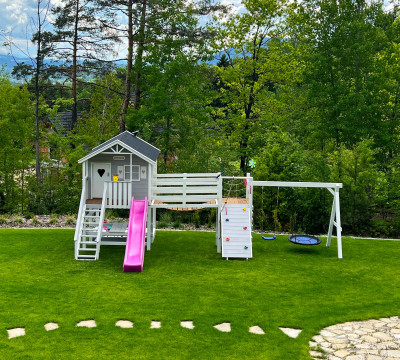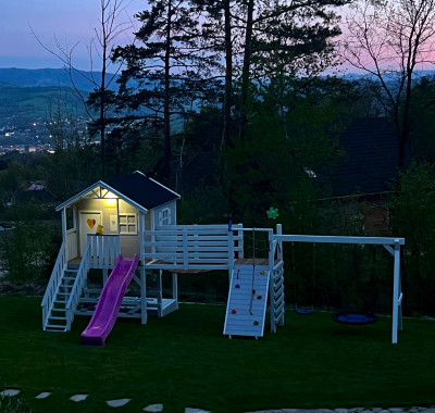Ten imponujący zestaw placu zabaw to spełnienie marzeń każdego małego odkrywcy! Duży domek połączony mostem z wieżą oraz stelażem na huśtawki tworzy prawdziwy tor przygód, który zachęca do aktywnej zabawy i rozwijania wyobraźni.