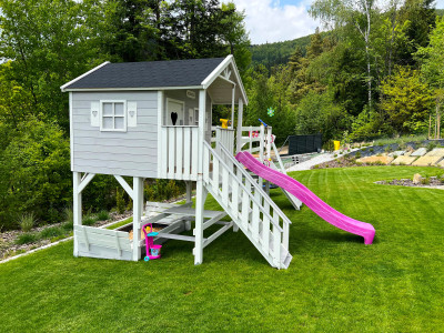 Pod domkiem znajduje się zamykana piaskownica, która pozwala na kreatywną zabawę w piasku w każdą pogodę. Tuż obok umieszczony został zestaw biwakowy – idealne miejsce na chwilę odpoczynku, przekąskę lub zabawę w piknik czy bazę.