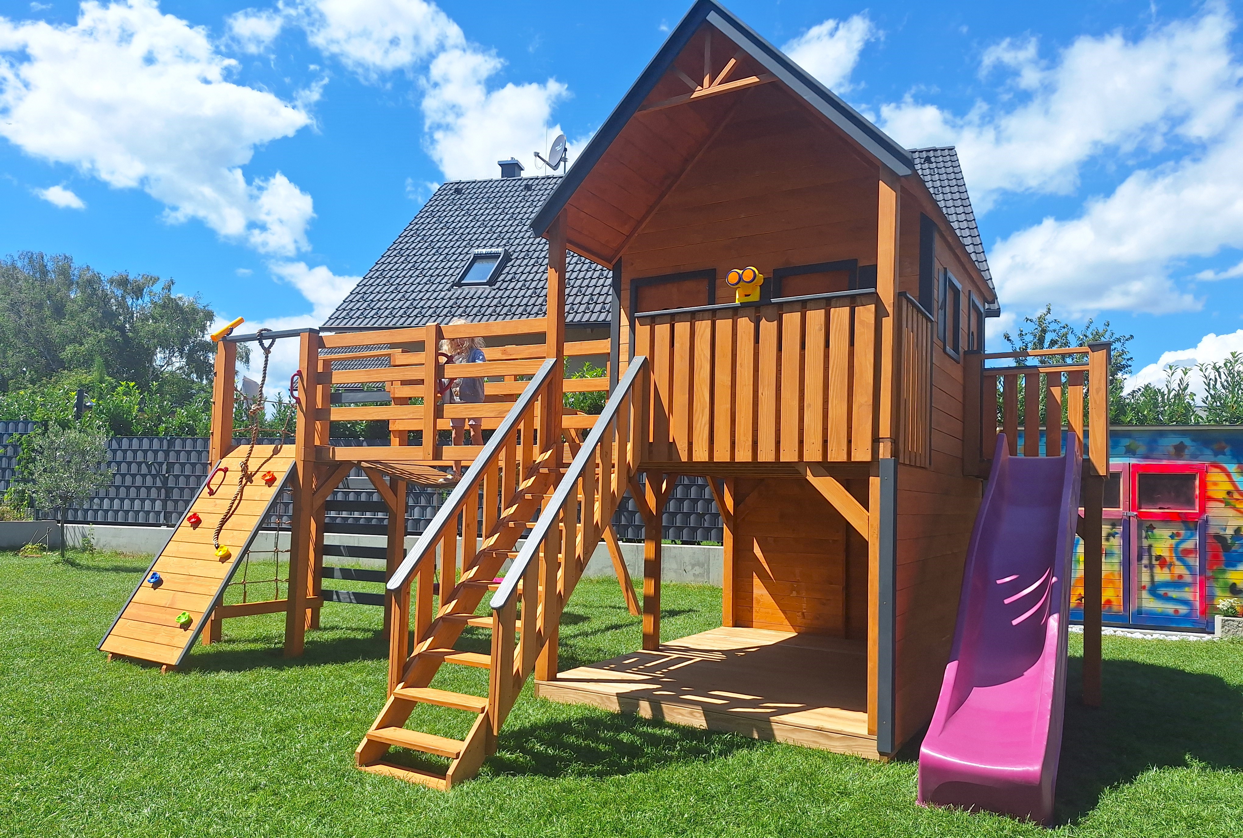 Wyjątkowy domek w góralskim stylu to prawdziwa perła wśród dziecięcych konstrukcji! Jego charakterystyczny dach o ostrym kącie 45° nadaje mu niepowtarzalny, tradycyjny wygląd rodem z gór. Pod domkiem znajduje się przestronny taras, idealny do odpoczynku i wspólnych zabaw. Całość urozmaica most prowadzący do wieży z atrakcjami, która staje się centrum przygód i odkryć. Ten domek to połączenie klimatu górskiej chaty z niezwykłym światem zabawy, który rozbudza wyobraźnię i zachęca do aktywności na świeżym powietrzu.