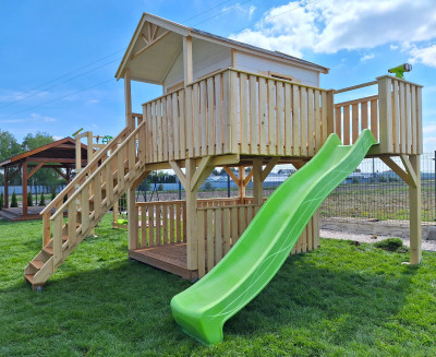 Konstrukcja domku w tej realizacji została pomalowana impregnatem w kolorze sosny naturalnej.