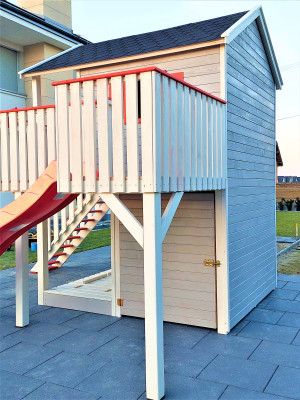 Domek o wymiarach podestu 200x240cm z dużym tarasem w kształcie litery L to ciekawa opcja.