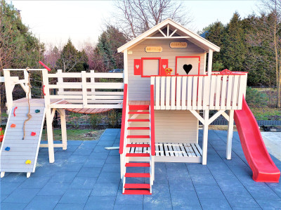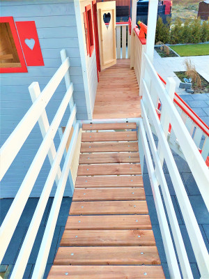 Aby przedostać się z domku na wieżę najpierw trzeba pokonać 2m most. Następnie z wieży możemy przejść na huśtawki.