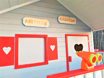 Domek posiada także zamykany garaż oraz piaskownicę.