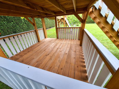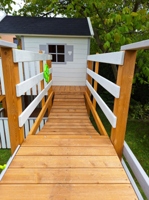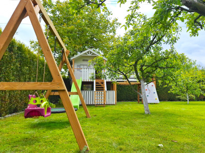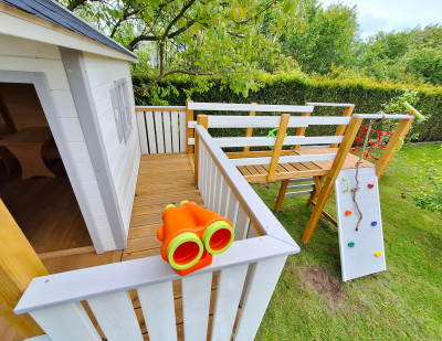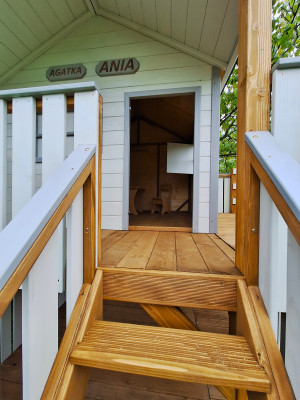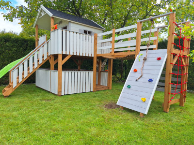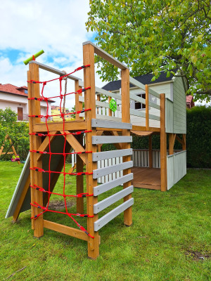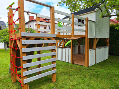 Fort Przygód to wyjątkowy zestaw zabawowy, który przenosi dzieci w świat wyobraźni i przygód! Głównym elementem jest domek z bocznym tarasem, z którego prowadzi most do efektownej wieży – idealnej do zabawy w rycerzy, odkrywców lub strażników fortecy. Pod domkiem znajduje się przestronny, zacieniony taras, zapewniający miejsce na odpoczynek w upalne dni. Całość uzupełnia wolnostojąca huśtawka, która dodaje zestawowi jeszcze więcej radości i ruchu. To doskonała przestrzeń do zabawy, relaksu i rozwijania dziecięcej wyobraźni.