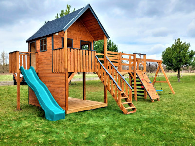 Kolorystyka użyta do malowania tego domku to połączenie lazury w kolorze tik i farby w odcieniu antracytu.