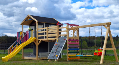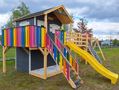 Duży domek z mostem, wieżą i stelażem na huśtawki umilą dzieciom zabawę.