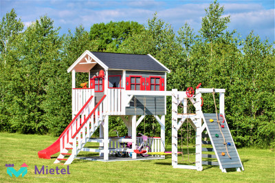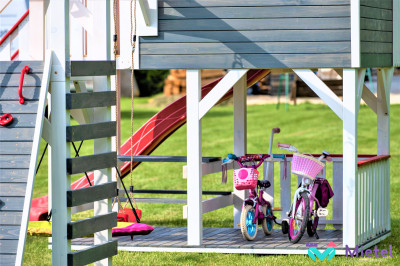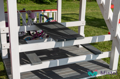 Składa się on z dwóch ławeczek i stolika, który umiejscowiony jest pod tarasem, dzięki czemu w słoneczne dni nasze pociech znajdą troszkę cienia.