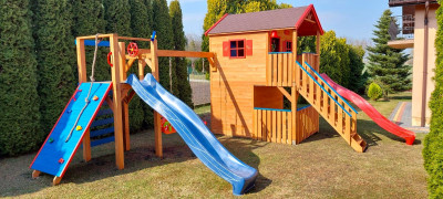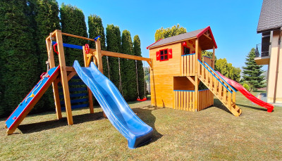 Przedstawiamy nową odsłonę naszego zestawu Ogrodowa Frajda! 🎉 Teraz z jeszcze większą dawką zabawy – dodaliśmy taras pod domkiem oraz drugą zjeżdżalnię na wieży, by radość z jazdy była podwójna! 🚀 Dodatkowo zestaw zyskał oświetlenie LED, które po zmroku tworzy magiczną atmosferę i sprawia, że zabawa może trwać nawet po zachodzie słońca. 🌟✨