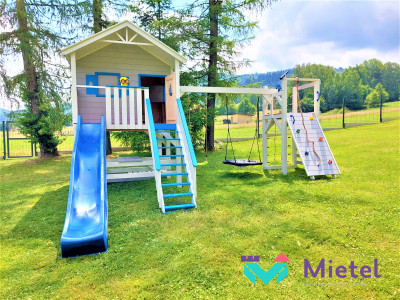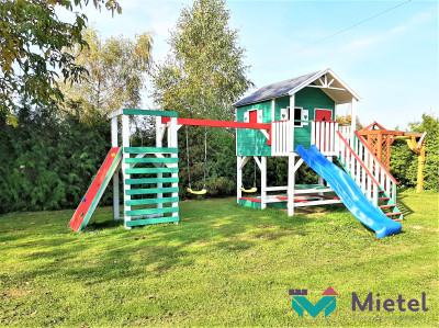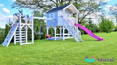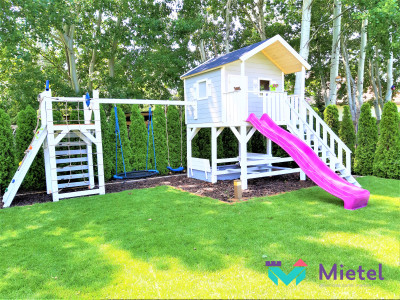Bogato wyposażony we wszystkie akcesoria zabawkowe, huśtawki oraz dwa krzesełka i stolik we wnętrzu domku.
