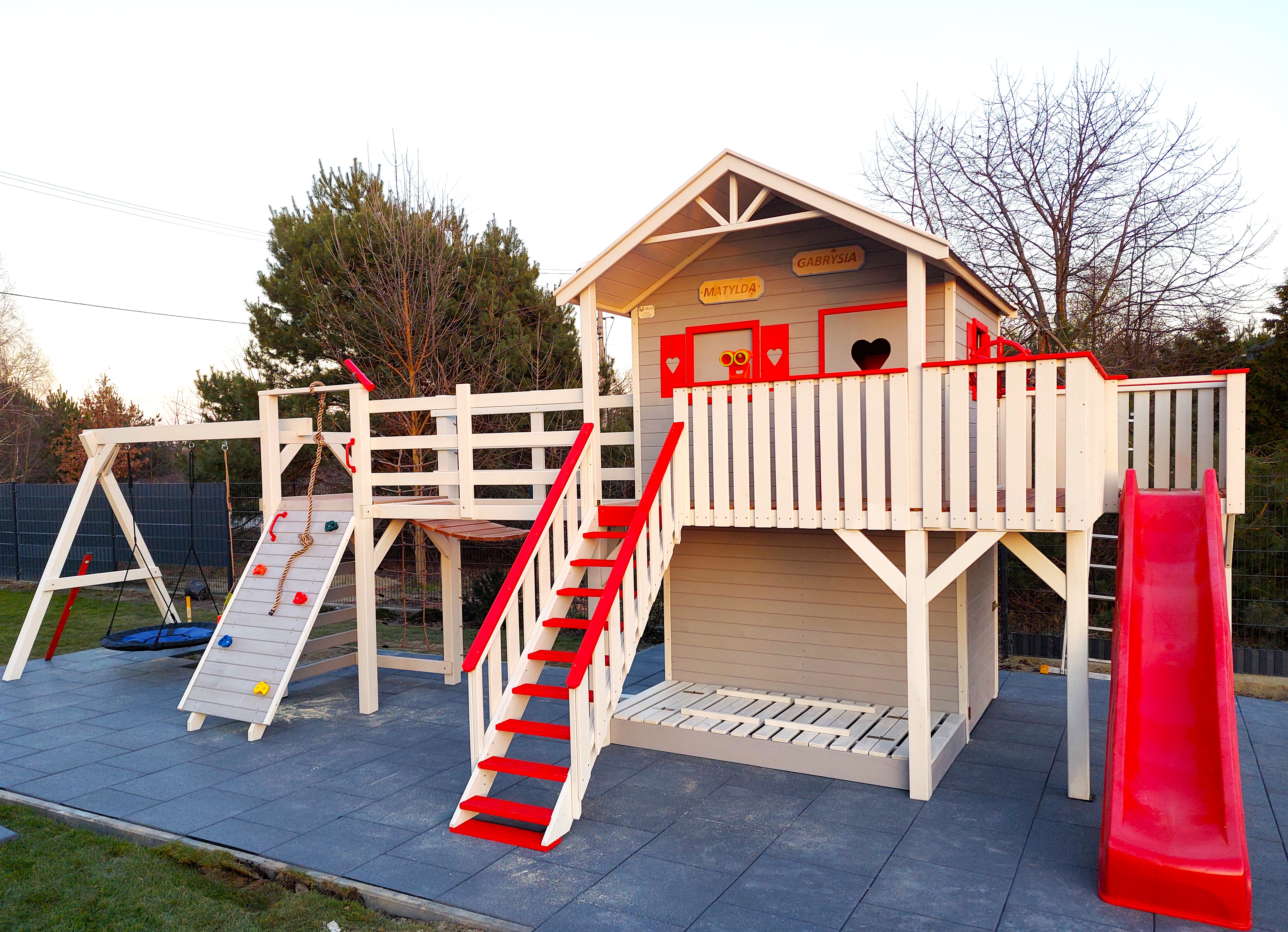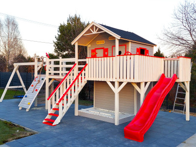 Aby przedostać się z domku na wieżę najpierw trzeba pokonać 2m most. Następnie z wieży możemy przejść na huśtawki.