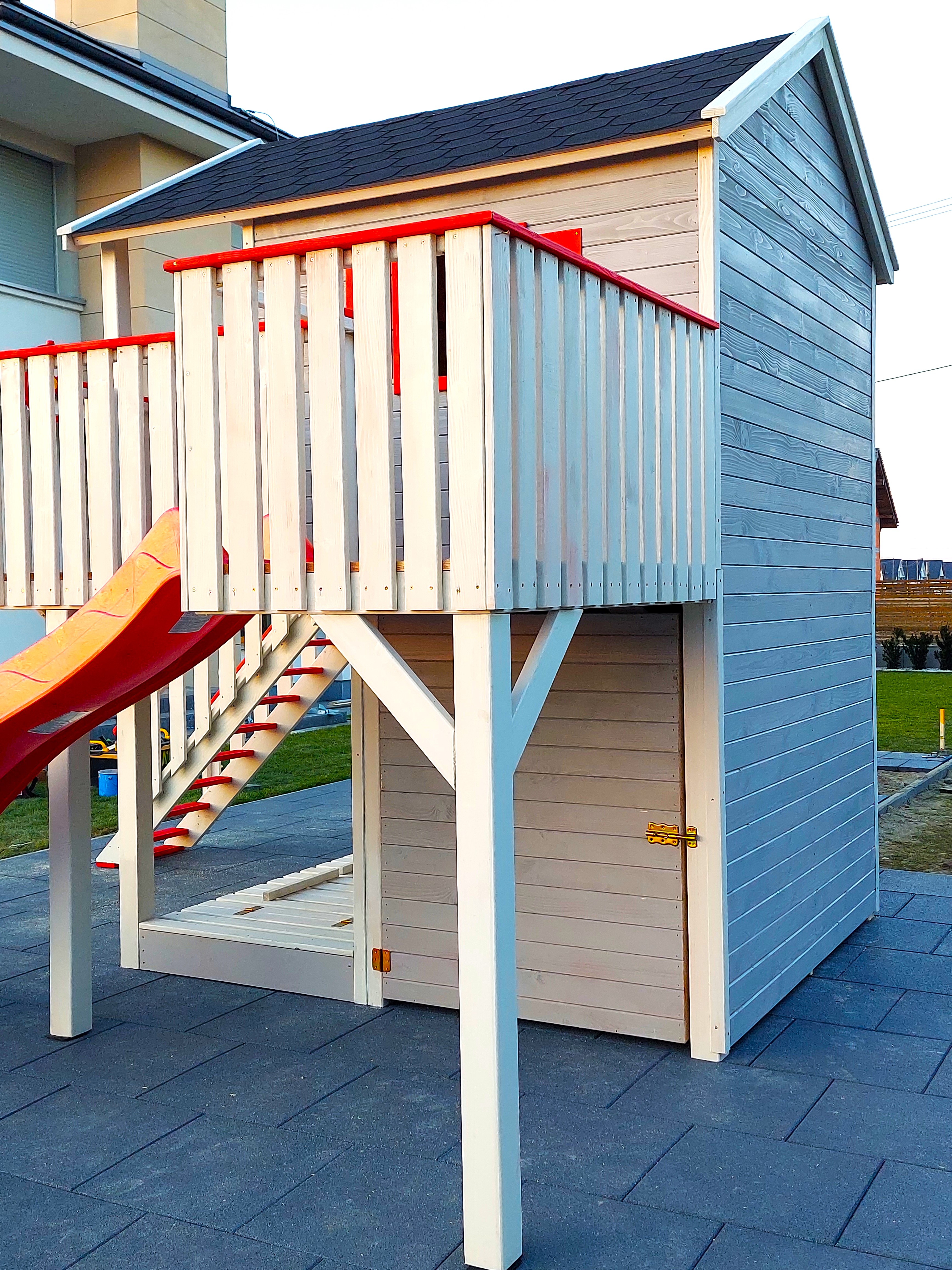 Domek o wymiarach podestu 200x240cm z dużym tarasem w kształcie litery L to ciekawa opcja.
