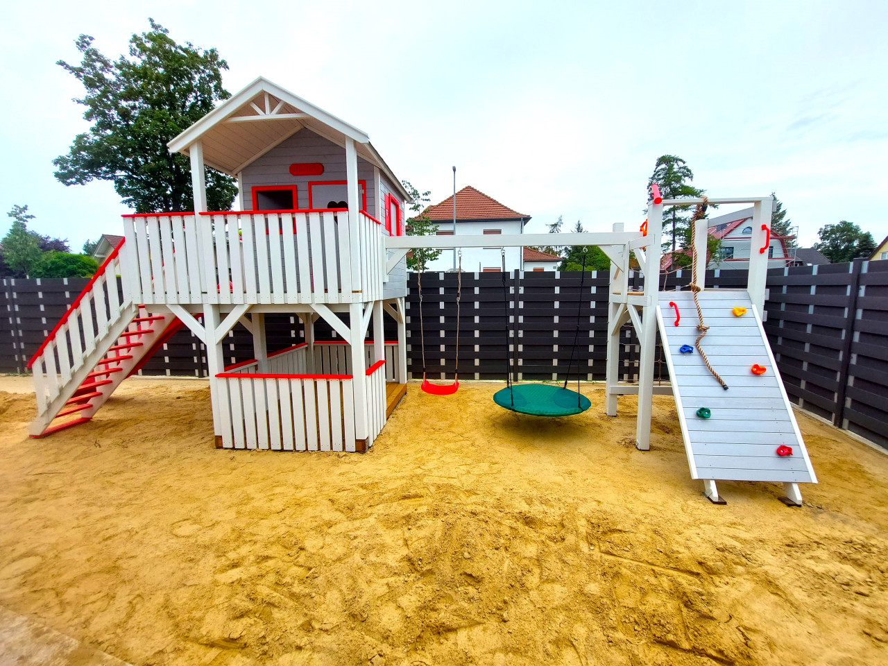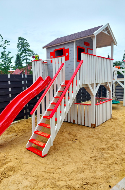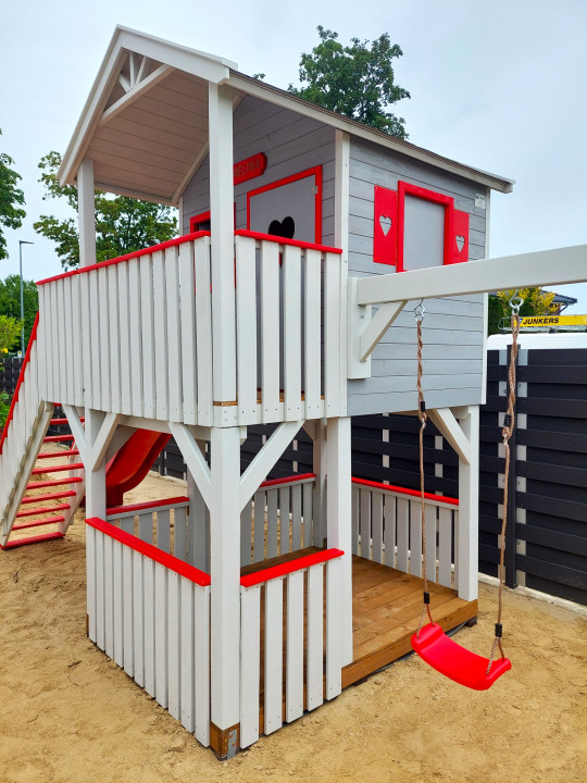 Zestaw wykonany jest solidnie, estetycznie i starannie, z zastosowaniem technik ciesielskich, dzięki czemu nasze maluchy będą w pełni bezpieczne, a przy tym ciekawa kolorystyka sprawia, że domek będzie idealną dekoracją naszego ogrodu.