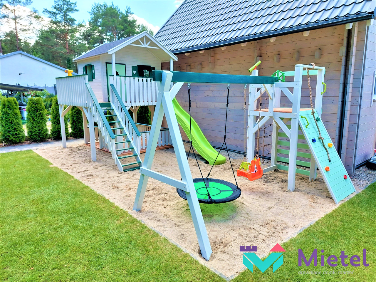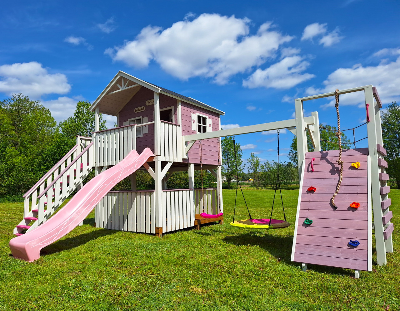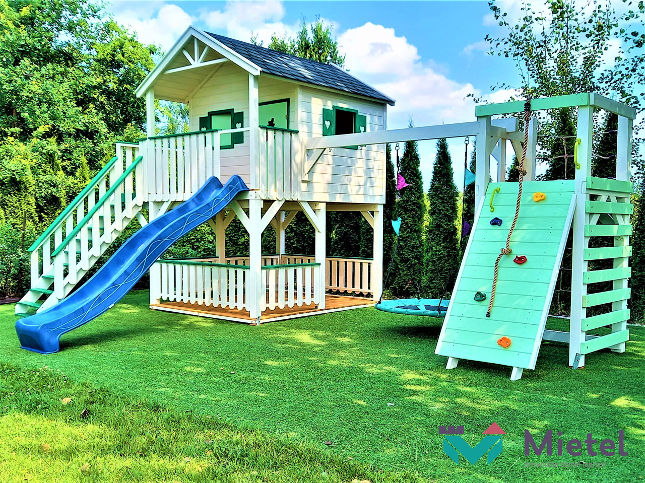 Domek „Miętowy” jest miejscem idealnym do zabawy, gier i spędzania czasu w sposób aktywny, gdzie każdy znajdzie coś dla siebie. Rozbudowany zestaw daje naszym pociechom bogaty wachlarz możliwości, a rodzicom gwarancję, że zapewniają swoim skarbom odpowiedni rozwój. Z pewnością i my, dorośli, zapragniemy towarzyszyć dzieciakom w zabawie.
