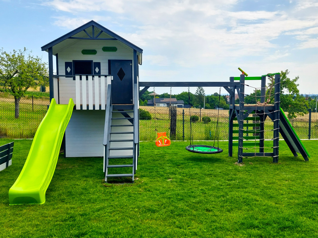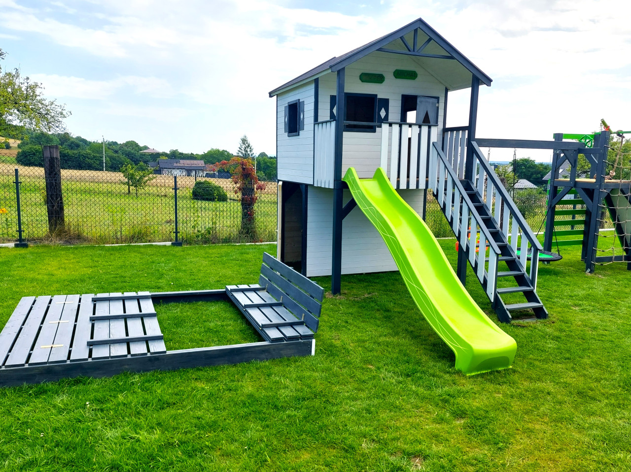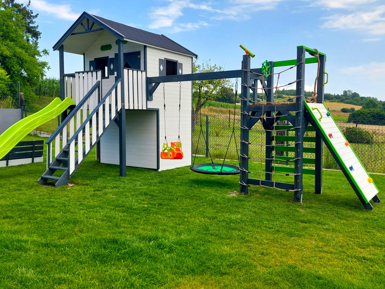 Zestaw wykonany jest solidnie, estetycznie i starannie, z zastosowaniem technik ciesielskich, dzięki czemu nasze maluchy będą w pełni bezpieczne, a przy tym ciekawa kolorystyka sprawia, że domek będzie idealną dekoracją naszego ogrodu.